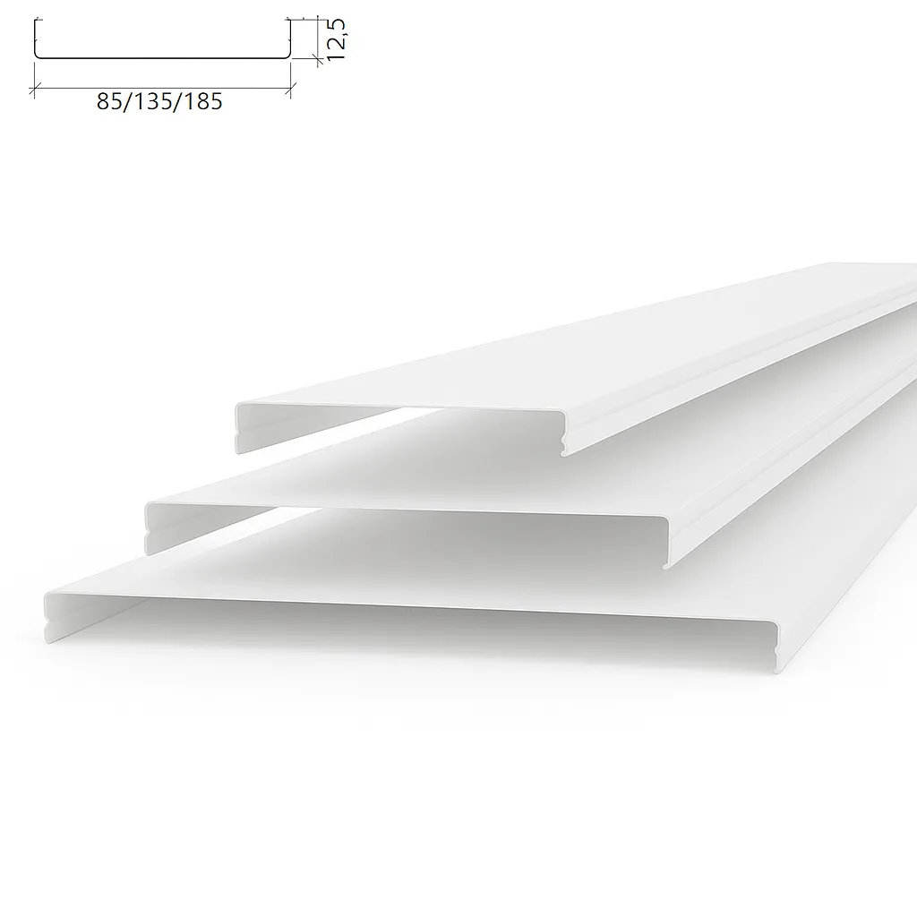 AN185A AL 0.5 — потолочная рейка немецкого типа с максимальной шириной 185 мм и толщиной алюминия 0,5 мм. Монтируется с открытым зазором 15 мм, шаг установки — 200 мм. Цвет — белый матовый, универсальный для большинства интерьеров. Повышенная жёсткость благодаря усиленному алюминию делает модель идеальной для высоких потолков и длинных пролётов.